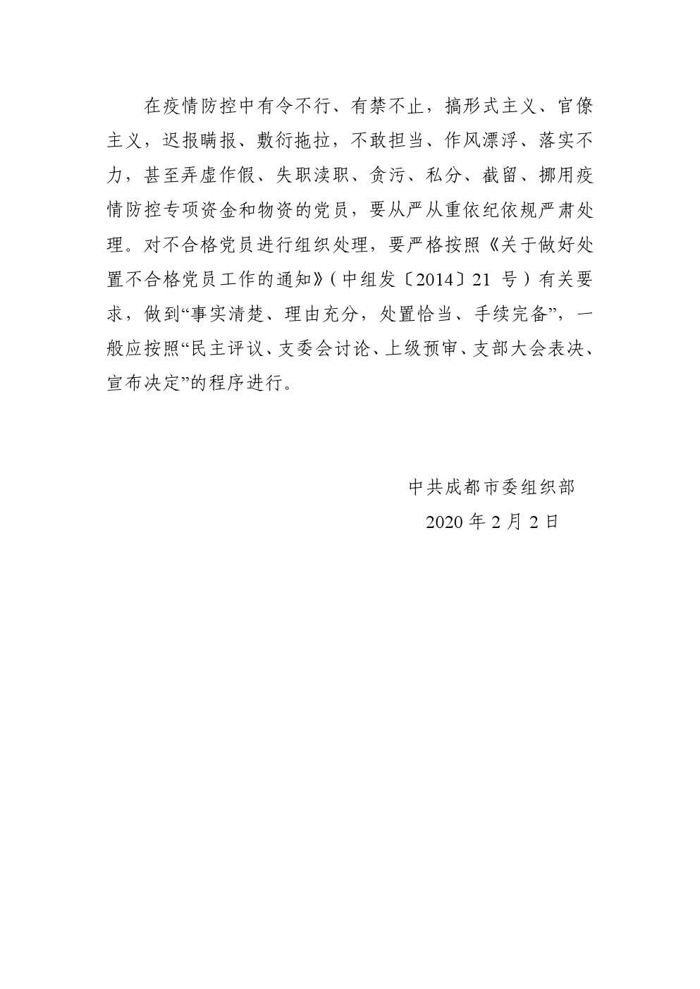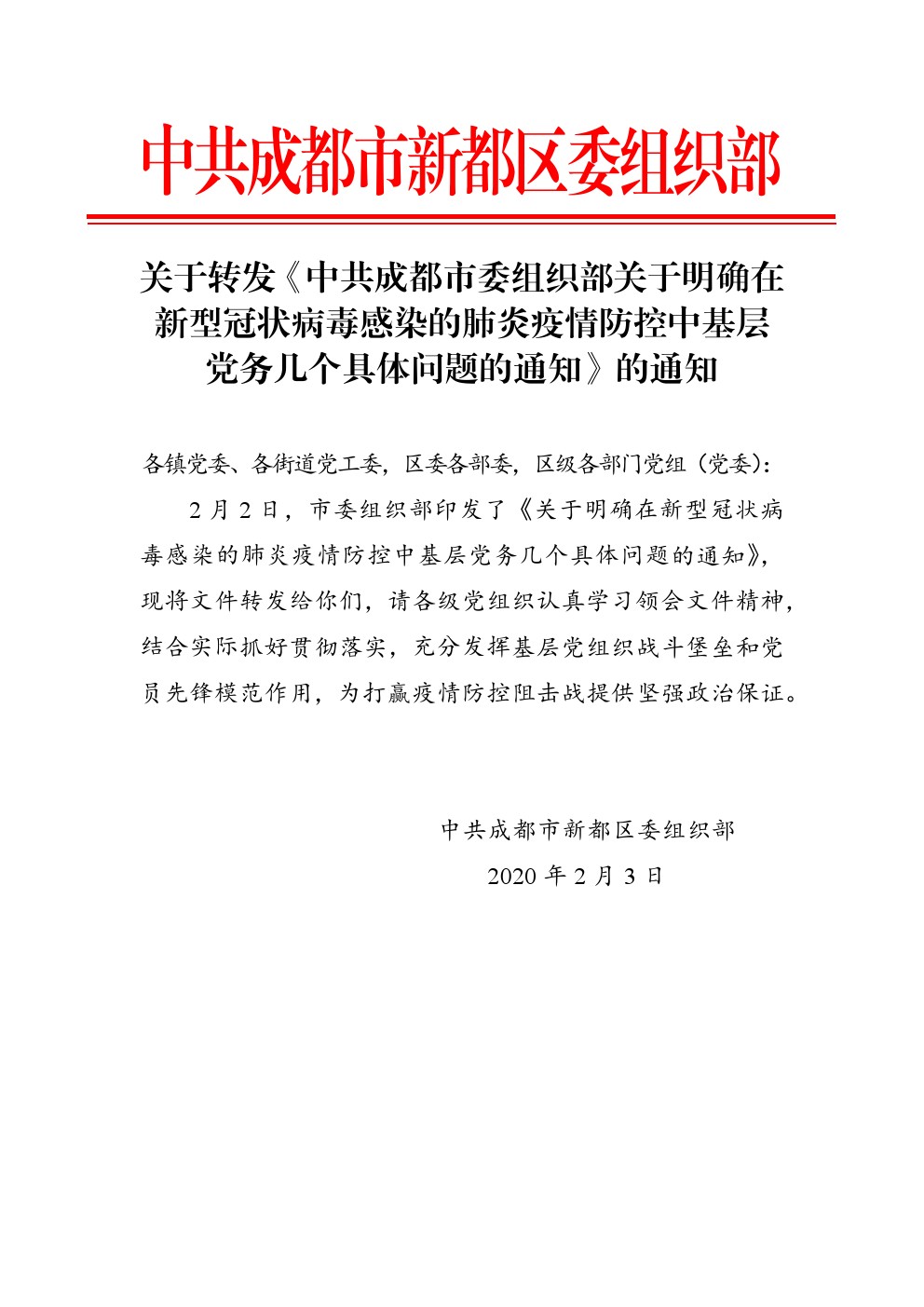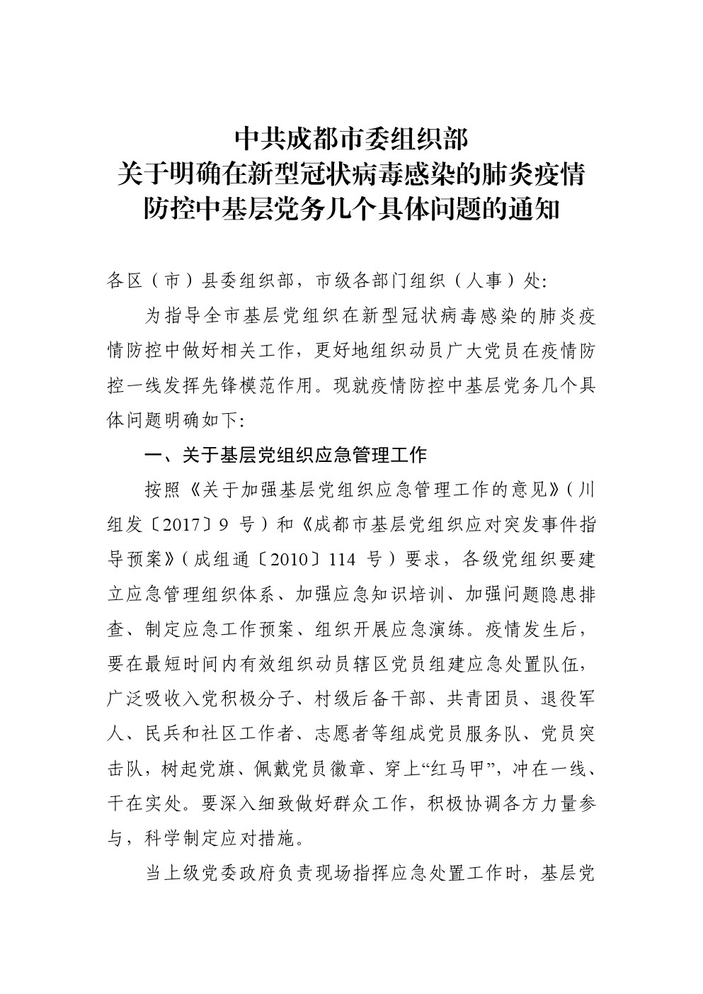 中共成都市委組織部關于明確在新型冠狀病毒感染的肺炎疫情防控中基層黨務幾個具體問題的通知