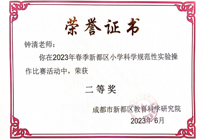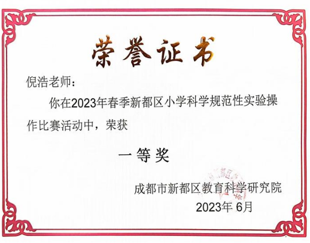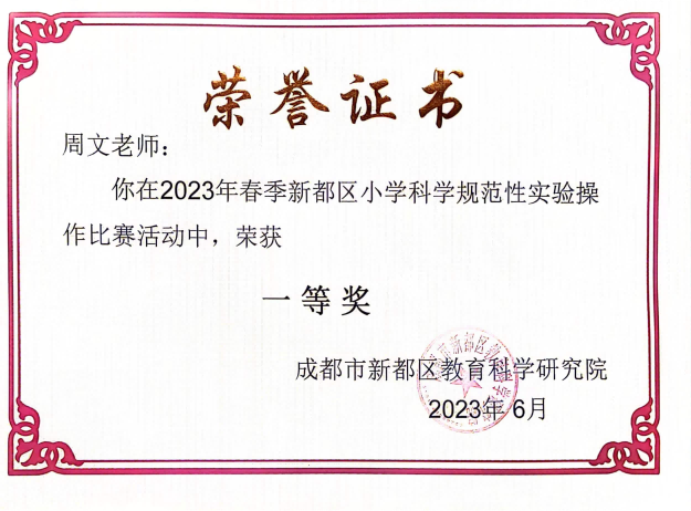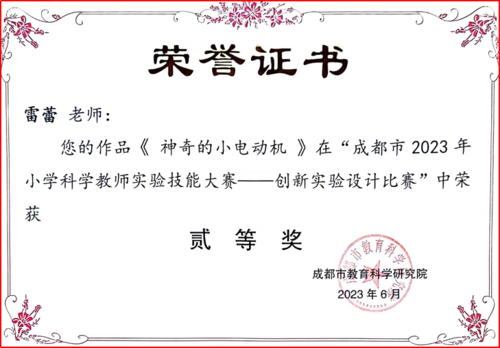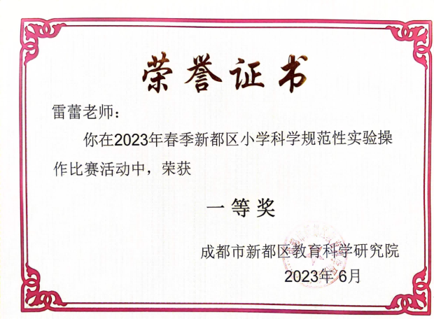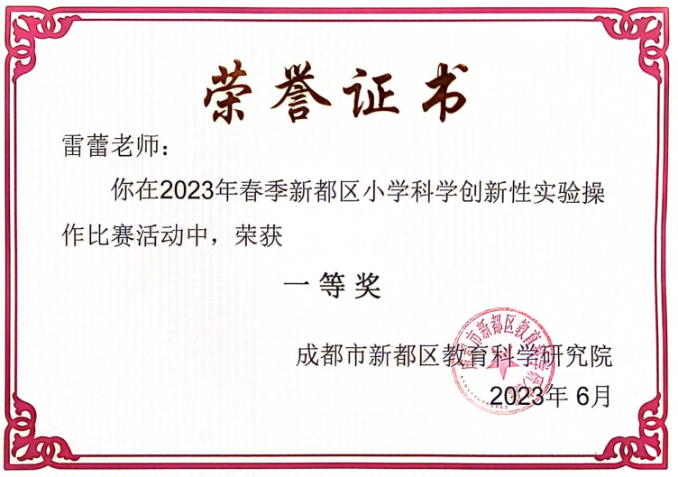在成都市2023年小學科學教師實驗技能大賽——小學科學創(chuàng)新性實驗操作比賽(新都賽區(qū))中,雷蕾老師榮獲一等獎。隨后雷蕾老師代表新都區(qū)參加成都市比賽,最終榮獲市級比賽二等獎。