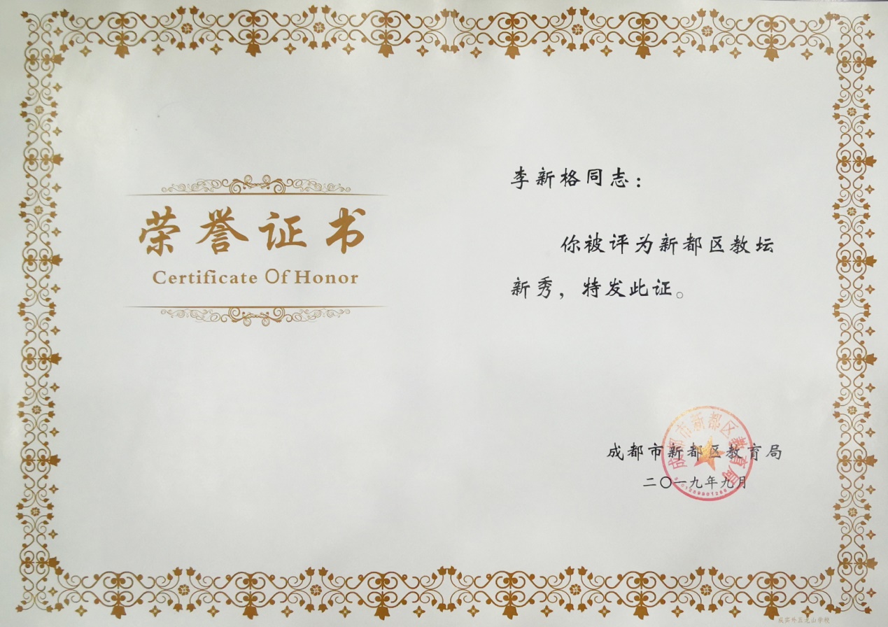 熱烈祝賀我校?李新格?老師被評為新都區教壇新秀