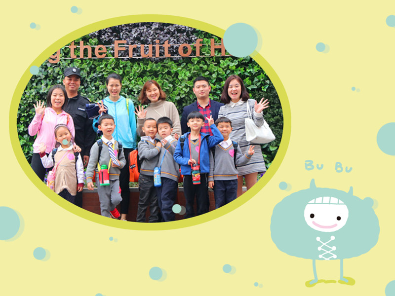 金蘋果幼稚園師生和實外五龍文主任、童老師在“植仁義理信、學(xué)琴棋書畫、開人文之花”校訓(xùn)墻前合影留念,張張笑臉像春天燦爛的花兒!