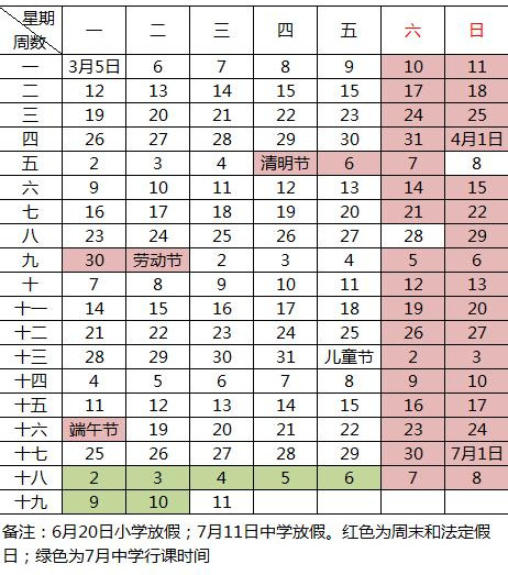 根據成都市教育局制定的2017-2018學年全日制中小學教學時間安排,2018年春季學期定于2018年3月4日辦理入學手續,3月5日正式行課,6月20日之前完成學業檢測,6月29日學期結束,6月30日正式放暑假,共計教學17周。但實際在校時間只有82天(按6月20日期末檢測算實際75天),不足三個月,共16周(包括考試和復習,實際教學時間只有14周),希望老師們在開學初做好教學統籌安排,也請孩子們珍惜時間,做時間的主人,合理科學安排好自己的學習與生活。下面是成都實外新都五龍山學校2018年春季學期校歷,以方便老師們和廣大家長查閱。