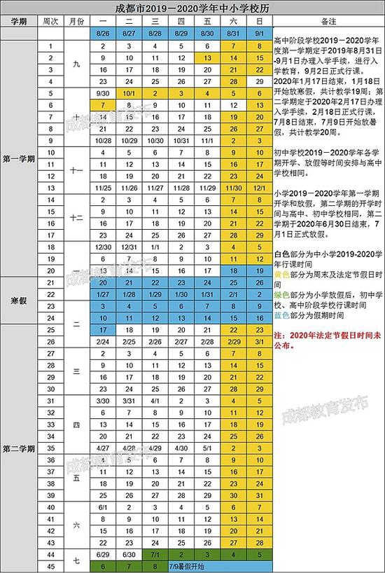 2019-2020學年度第一學期定于2019年8月31日-9月1日辦理入學手續,進行入學教育,9月2日正式行課。2020年1月17日結束,1月18日開始放寒假,共計教學19周。第二學期定于2020年2月17日辦理入學手續,2月18日正式行課,6月30日結束,7月1日正式放假,共計教學19周。每學期除去復習1周、檢測1-2周(期中或期末)、學校大型活動1周(上期體育節、下期藝術節)、學術研討活動1周,真正行課時間只有14周時間。