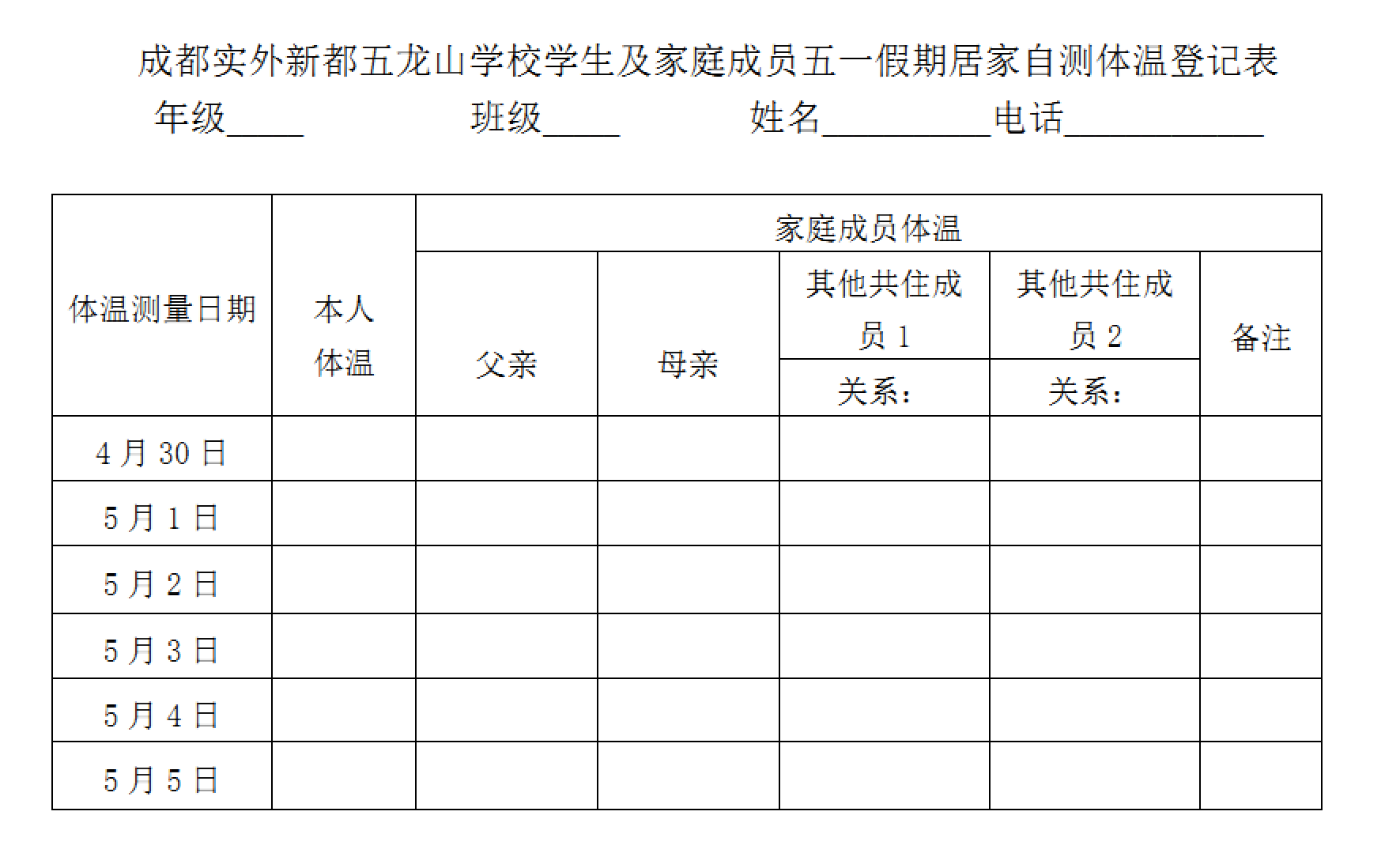 5、根據學校疫情防控工作要求,認真做好每日體溫“三檢”,填好《成都實外新都五龍山學校學生及家庭成員五一假期居家自測體溫登記表》并由家長簽字(表格見附件),開學后交由班主任收取。