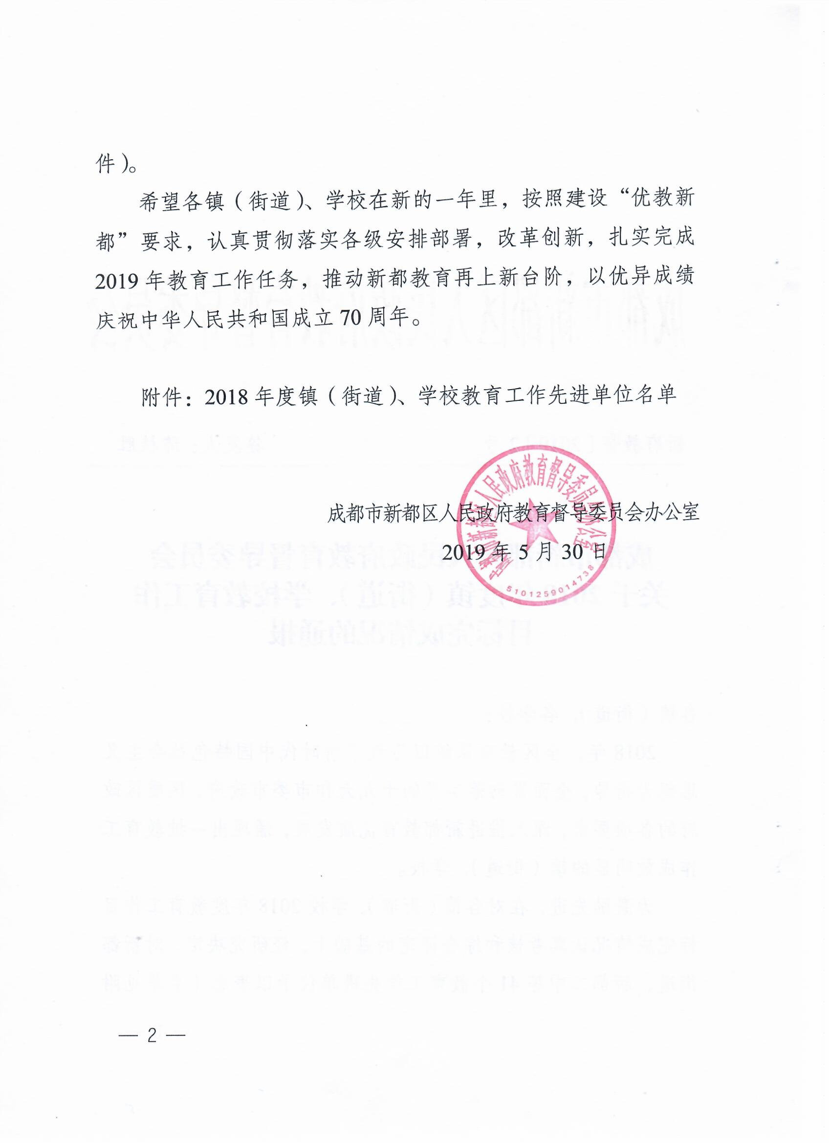 熱烈祝賀我校被評為新都區(qū)學(xué)校教育工作先進(jìn)單位