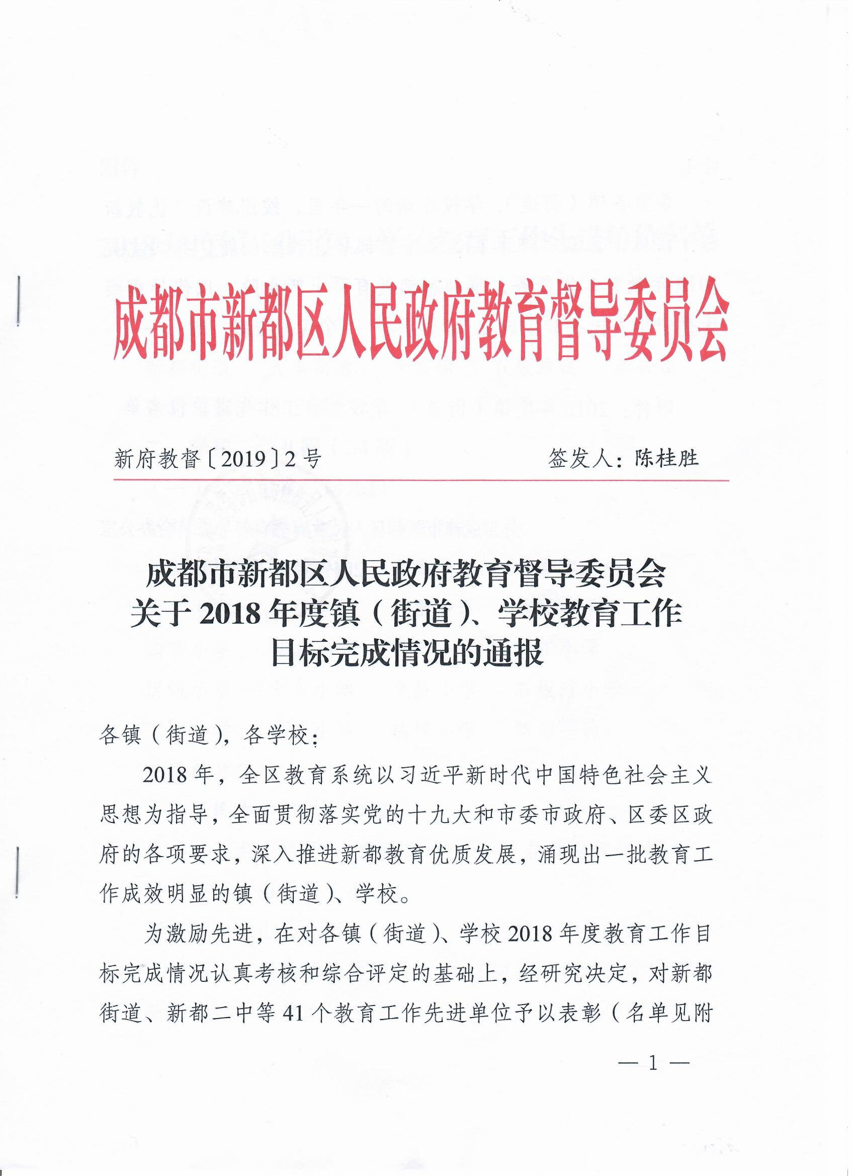 2019年5月,成都市新都區(qū)人民政府教育督導(dǎo)委員會對2018年度鎮(zhèn)(街道)、學(xué)校教育工作目標(biāo)完成情況進(jìn)行了全區(qū)通報(bào),成都實(shí)外新都五龍山學(xué)校榮幸被評為“學(xué)校教育工作先進(jìn)單位”,特此祝賀!
