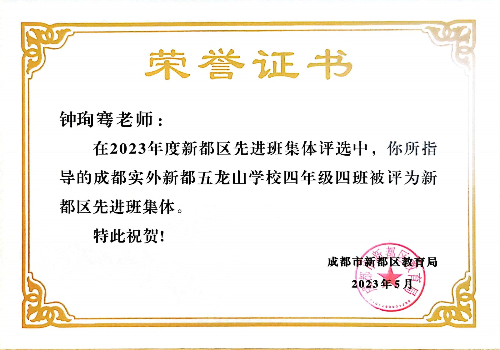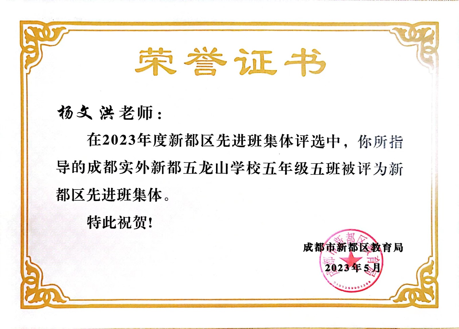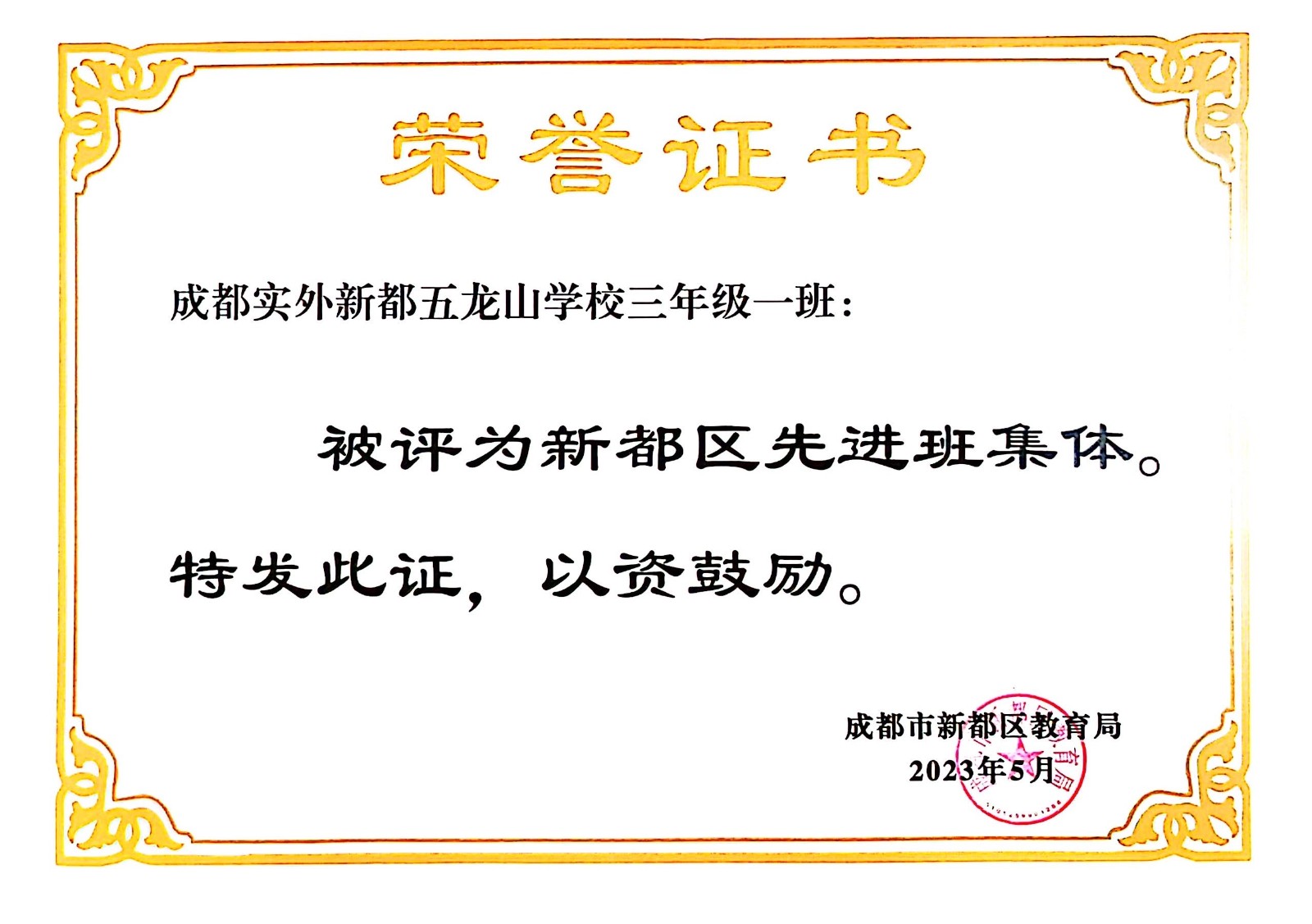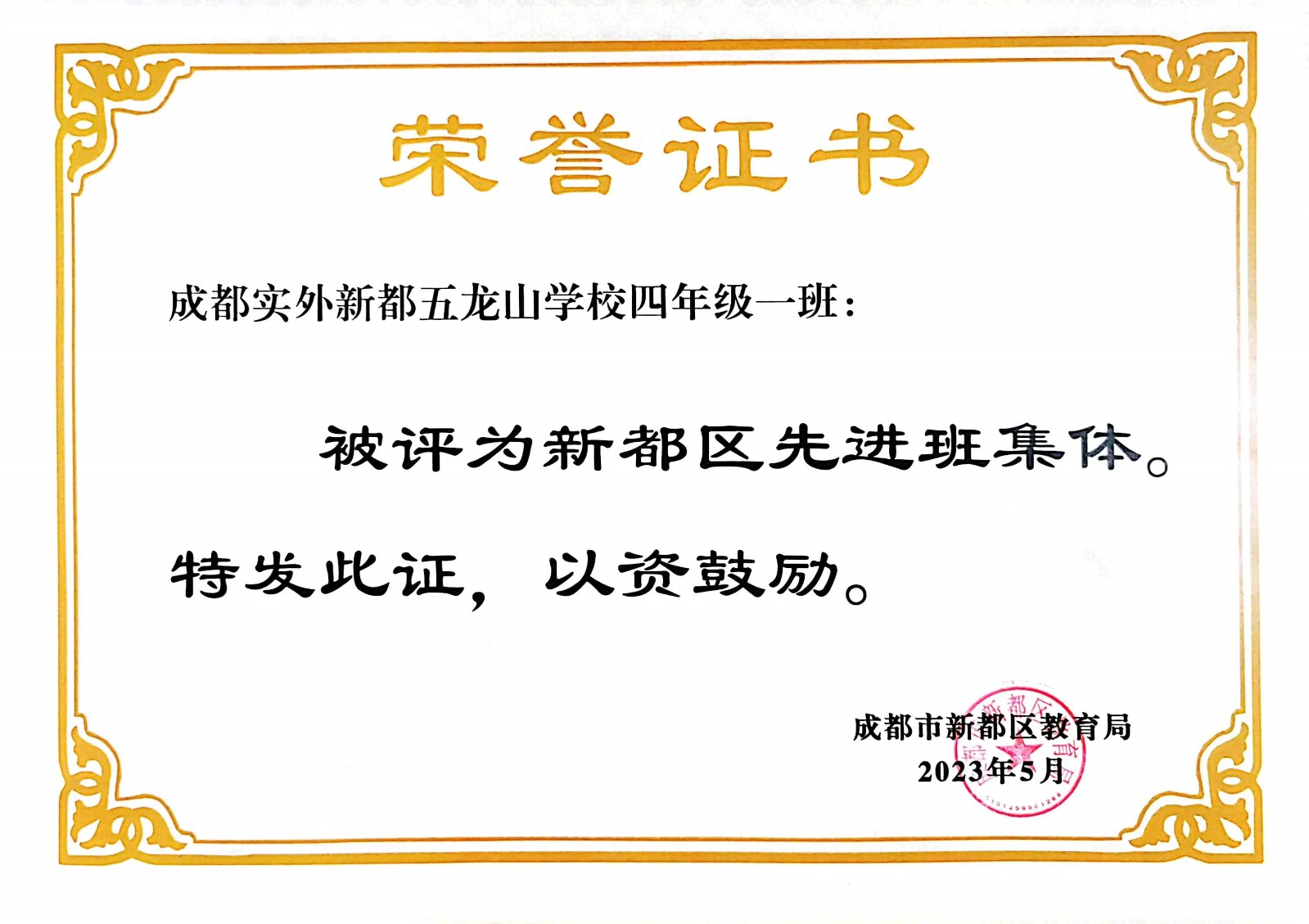 2023年5月31日,評選結果揭曉,我校三一班、四一班、四四班、五五班共4個班集體榮獲“新都區先進班集體”稱號。6月5日“相約星期一”,韓智軍校長、袁妍校長助理為4個班集體頒發了獎狀。