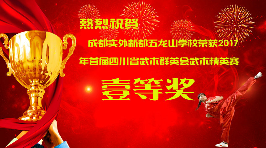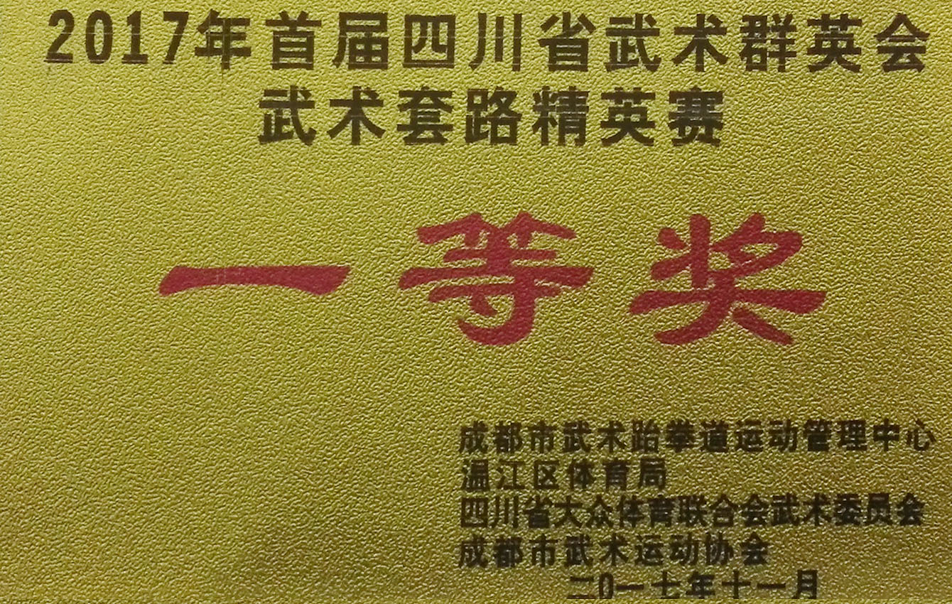在2017年11月,四川省首屆武術套路精英賽在溫江區成功舉辦,本次活動由成都市武術跆拳道運動管理中心、溫江區體育局、四川省大眾體育聯合會武術委員會、成都市武術運動協會主辦,我校代表隊旗開得勝,斬獲一等獎,特此表示祝賀!