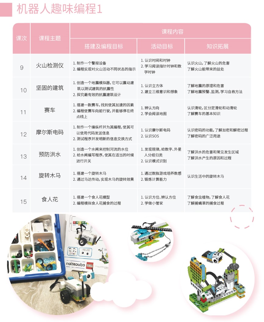 ii. 課程內(nèi)容: 搭建樂高電動(dòng)模型和編寫簡(jiǎn)單的程序,結(jié)合計(jì)算機(jī)知識(shí)專題課堂活動(dòng),在多維度知識(shí)擴(kuò)展的同時(shí),啟蒙學(xué)生的計(jì)算機(jī)思維。重在鼓勵(lì)和激發(fā)小朋友學(xué)習(xí)科學(xué)、工程、編程相關(guān)課程的興趣。課程強(qiáng)調(diào)運(yùn)用工具尋找答案,解決實(shí)際生活中的問題,課程分為探究階段-創(chuàng)造階段-測(cè)試階段-分享階段。