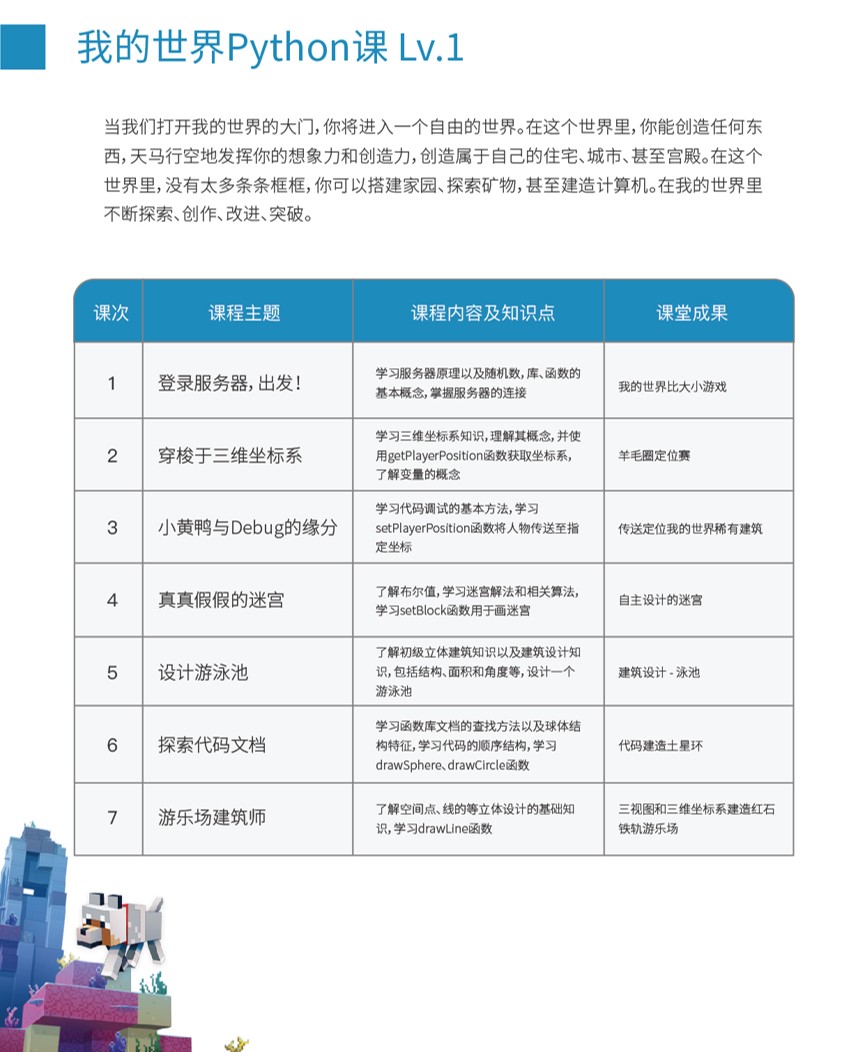 ii. 課程內(nèi)容:結(jié)合python編程語言和我的世界Minecraft益智游戲,在游戲世界中創(chuàng)建出智能的建筑和獨特的游戲劇情。透過游戲看技術(shù),玩轉(zhuǎn)互聯(lián)網(wǎng)、服務(wù)器、堆棧概念。課程中綜合應(yīng)用數(shù)學(xué)知識、代碼函數(shù)和邏輯,完成充滿挑戰(zhàn)的代碼設(shè)計。