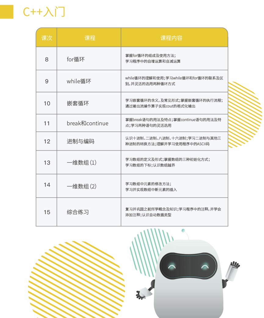 ii. 課程簡介:由淺入深的C++各種程序概念、基本語法的學(xué)習(xí)。并非傳統(tǒng)的C++學(xué)習(xí),針對孩子興趣,設(shè)計很多幫助理解的生活案列、以及有趣的習(xí)題。大量的算法練習(xí),在不斷的練習(xí)中總結(jié)思路,提升思維能力,過程中會有大量的數(shù)學(xué)訓(xùn)練,逐步引入信息學(xué)奧賽的考點(diǎn),完成全國青少年信息學(xué)奧林匹克競賽(NOIP)的成語言基礎(chǔ)知識鋪墊,助力升學(xué)。