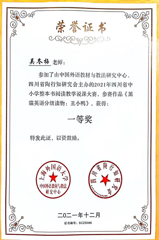 熱烈祝賀我校吳冬梅老師在由中國外語教材與教法研究中心、四川省陶行知研究會主辦的2021年四川省中小學整本書閱讀教學說課大賽中,參賽作品《黑貓英語分級讀物:丑小鴨》榮獲一等獎。